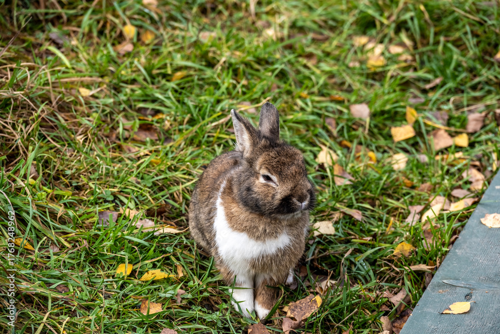 A rabbit in its natural habitat on an autumn day on a green lawn.