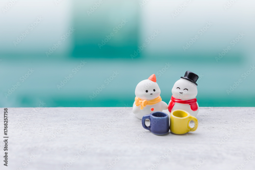 Miniature snowman with two ceramic cup over blurred background, Christmas background idea, outdoor day light