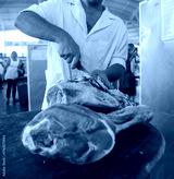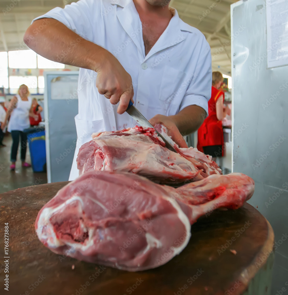 Butcher skillfully preparing meat at a local market during the busy afternoon hours in a vibrant community setting