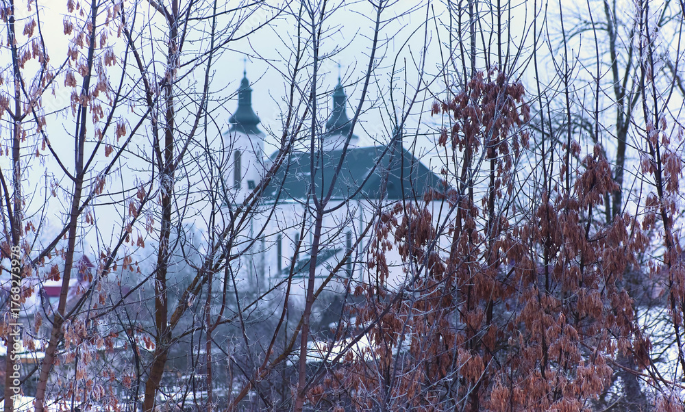 Snowy winter scene with a church and bare trees in a quiet landscape