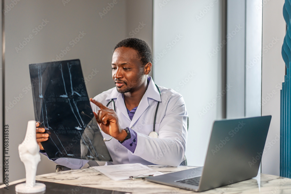 Medical doctor male analyzing patients roentgen and writing results in clipboard, The patient's symptoms from the X-ray and the results are reported online via video conferencing in laptop computer