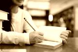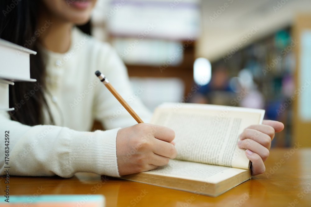 Asian young Student doing homework in library of university or college with various book and stationary over the book shelf background, Back to school