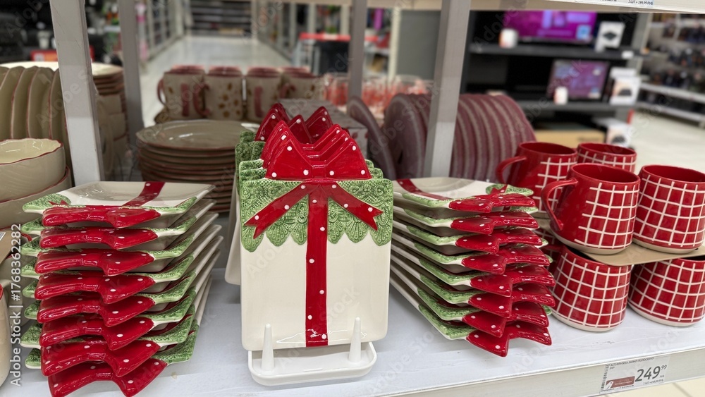 Festive holiday plates and mugs with red and green Christmas gift design on store shelves