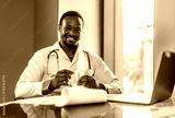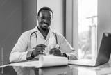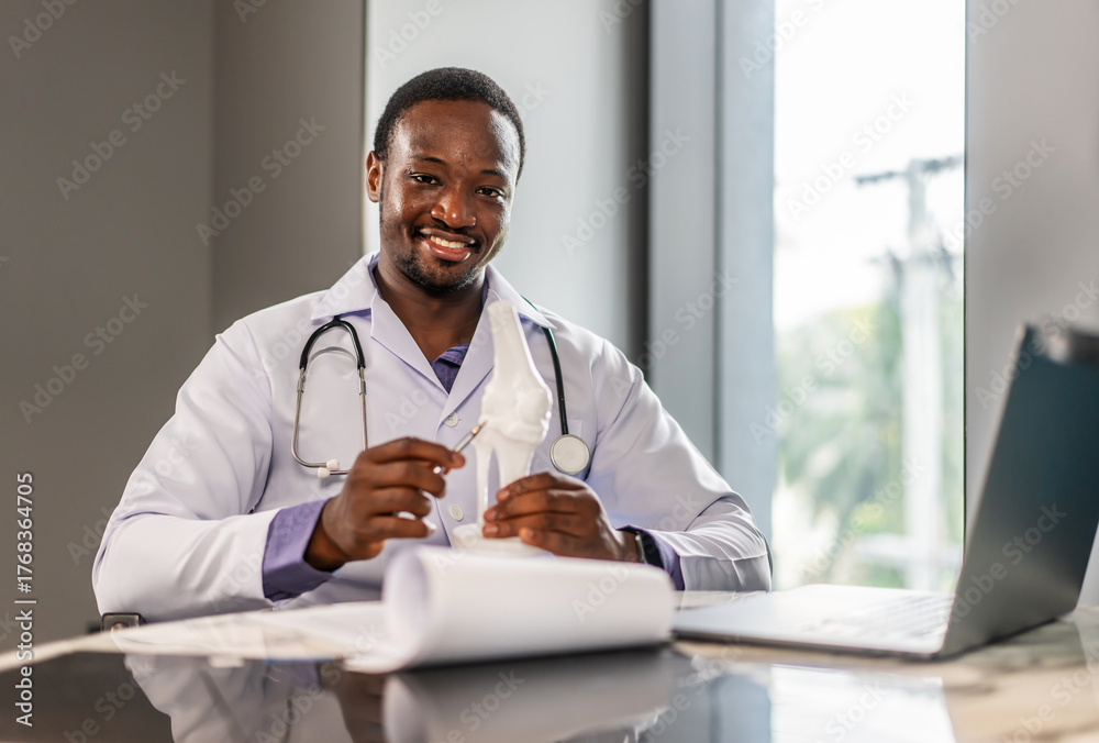 Online medical consultation. African american male orthopedic doctor showing foot skeleton, ankle joint anatomy model explain for patient through talking video call. Physiotherapy treatment, Medical