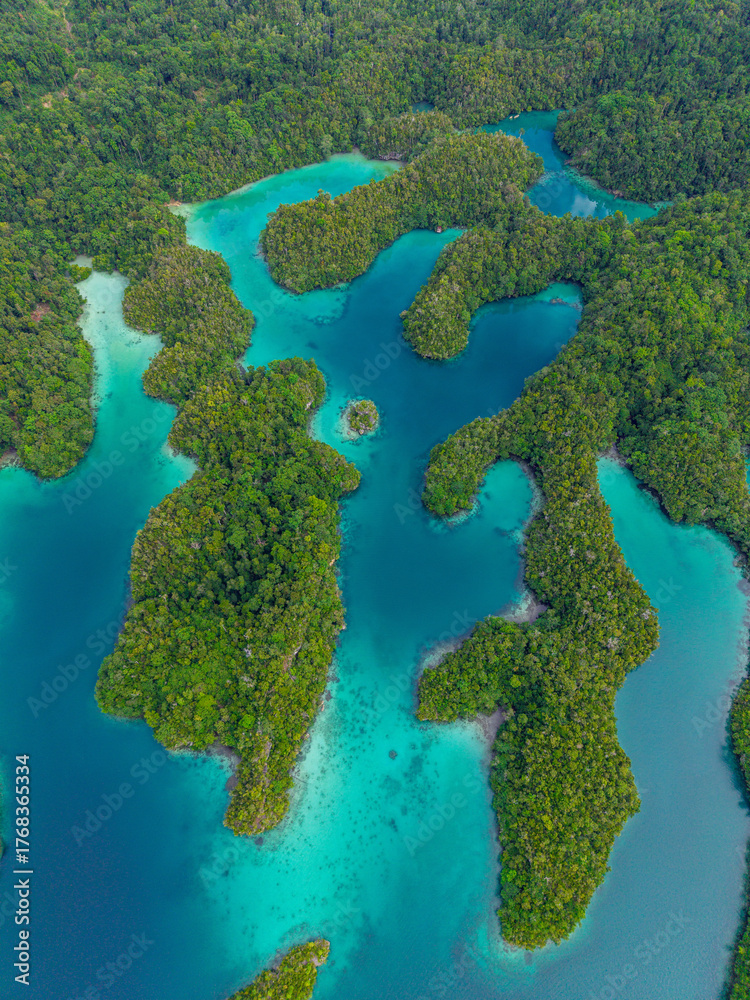 Aerial view of winding tropical lagoons surrounded by lush green islands and turquoise water in Raja Ampat, Indonesia.