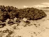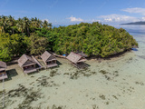 Aerial view of wooden stilt bungalows over clear shallow turquoise water near a tropical island in Raja Ampat, Indonesia.