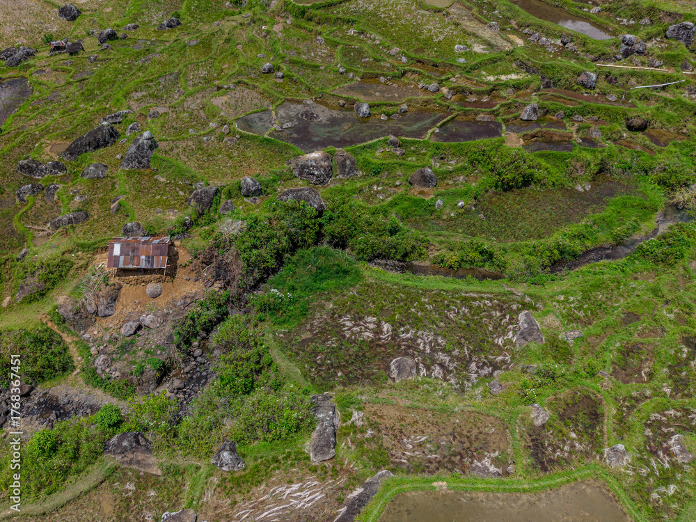 Aerial view of rice fields and traditional houses surrounded by green hills in Tana Toraja, Indonesia.