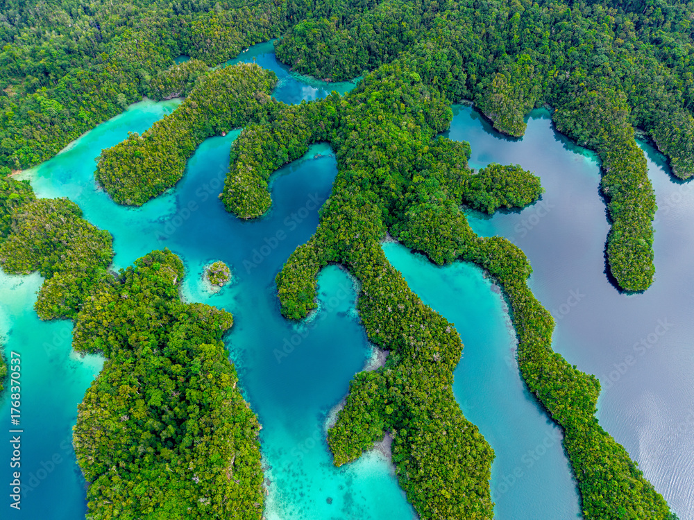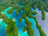 Aerial view of winding tropical lagoons surrounded by lush green islands and turquoise water in Raja Ampat, Indonesia.
