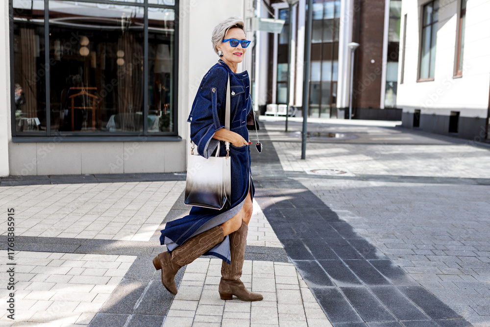 Stylish mature woman in blue denim coat and skirt with cowboy boots and ombre handbag walking in modern city street. Fashionable senior female enjoying elegance and urban fashion outdoors