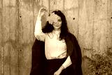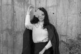 Beauty fashion woman holding a yellow maple leaf over one eye, wearing a white sweater and gray coat, standing against a concrete wall in autumn. Pretty stylish fall girl