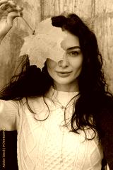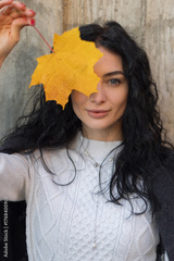 Woman with dark curly hair holding a yellow maple leaf over one eye, wearing a white sweater and gray coat, standing against a wooden wall in autumn.