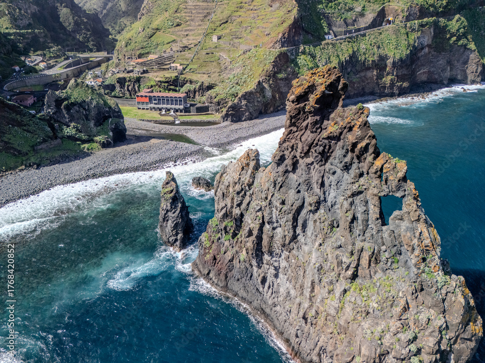 Dramatic view of volcanic cliffs and rock formations along the coast of Ribeira da Janela, Madeira Island, Portugal, with deep blue Atlantic waters.