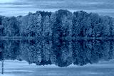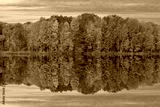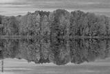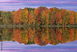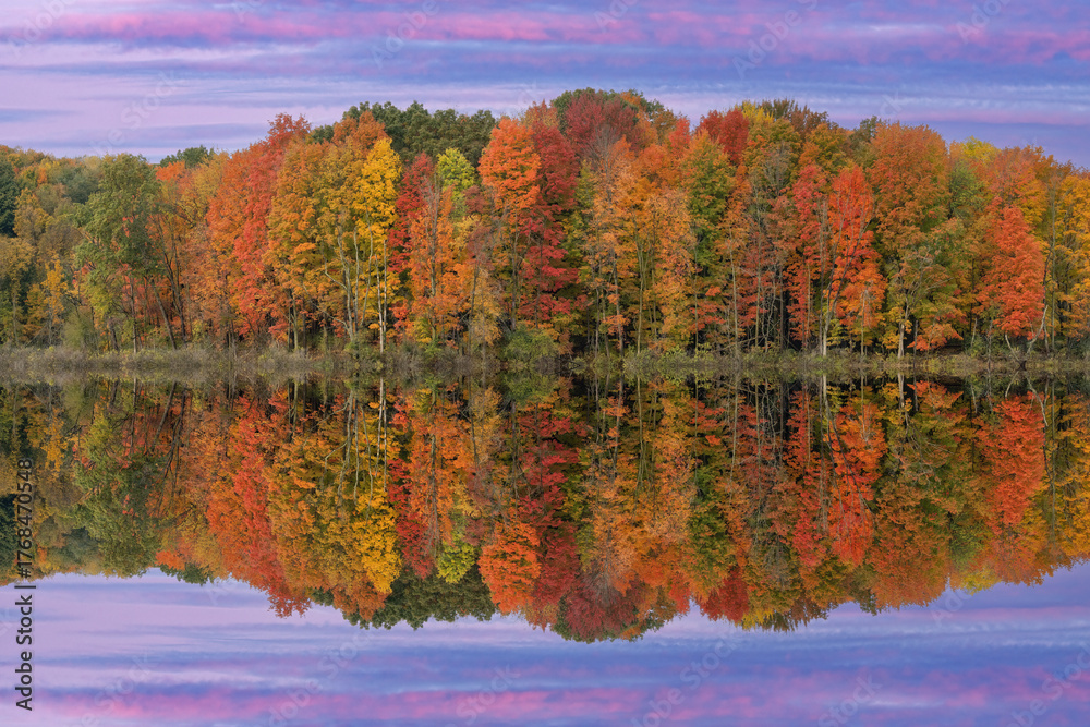 Autumn landscape at dawn of the shoreline of West Twin Lake with mirrored reflections in calm water, Kalamazoo, Michigan, USA