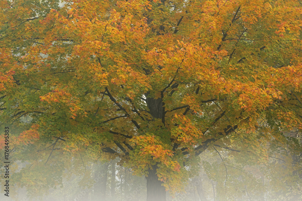 Autumn landscape of a maple in fog, Yankee Springs State Park, Michigan, USA