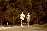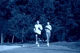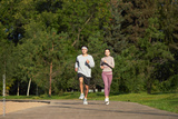 Caucasian young adult man and Caucasian young adult woman jogging together on park path, both focused on exercise, surrounded by green trees, engaging in outdoor fitness activity