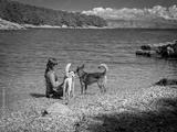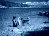 Woman in bikini sits by the clear turquoise water with her two dogs on a quiet Adriatic beach. Surrounded by pine trees and rocky shores, the scene radiates peace and connection with pristine nature.