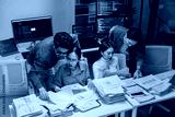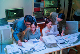 Asian programmer team is intensely working late night in an office, collaboratively coding AI train systems and AI agents at an agile hackathon workshop, using monitor screens to brainstorm and discus