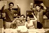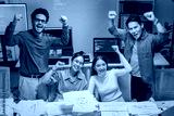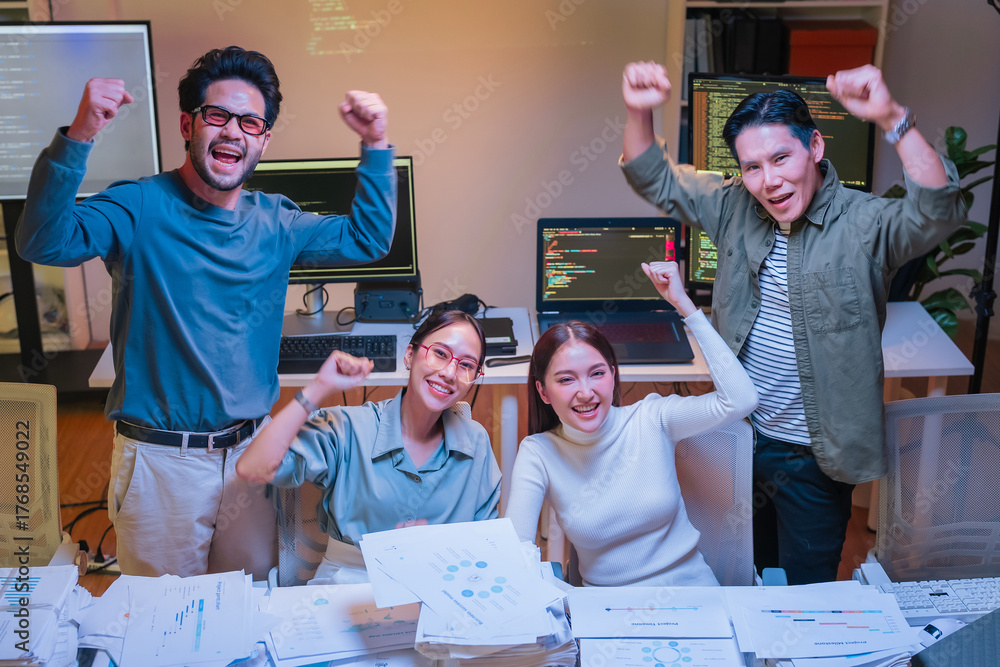 Portrait of a successful programmer team collaborating at night to train advanced AI agents, coding innovative machine learning models, and developing intelligent algorithms through teamwork creative