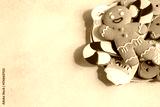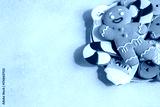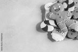 Gingerbread cookies with icing decoration. Christmas food. Gingerbread man baking. Top view table. Xmas sweet on biege background copy spase.