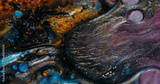Ink stream. Oil bubbles. Defocused yellow blue purple color acrylic sparkling water glitter flow floating on abstract art background.