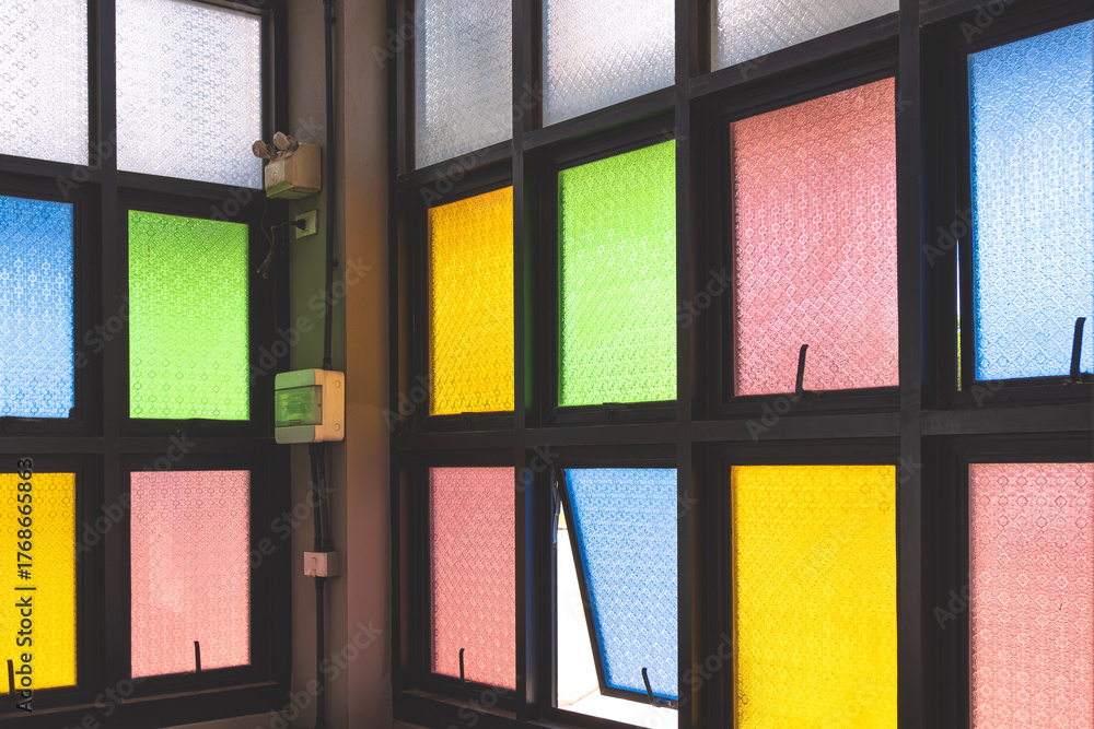 Colorful geometric stained glass window panels with emergency light and bright light shining through creates a vibrant, artistic, and decorative interior architecture design. Perspective side view