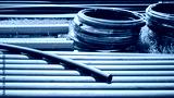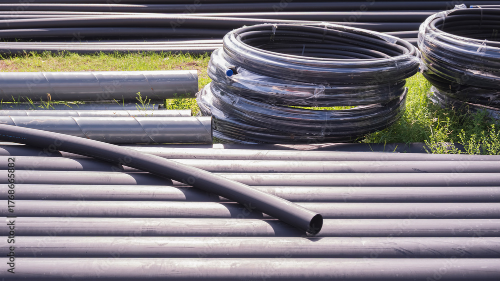 Group of black HDPE pipes on the ground in construction site for underground water piping installation work.