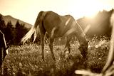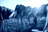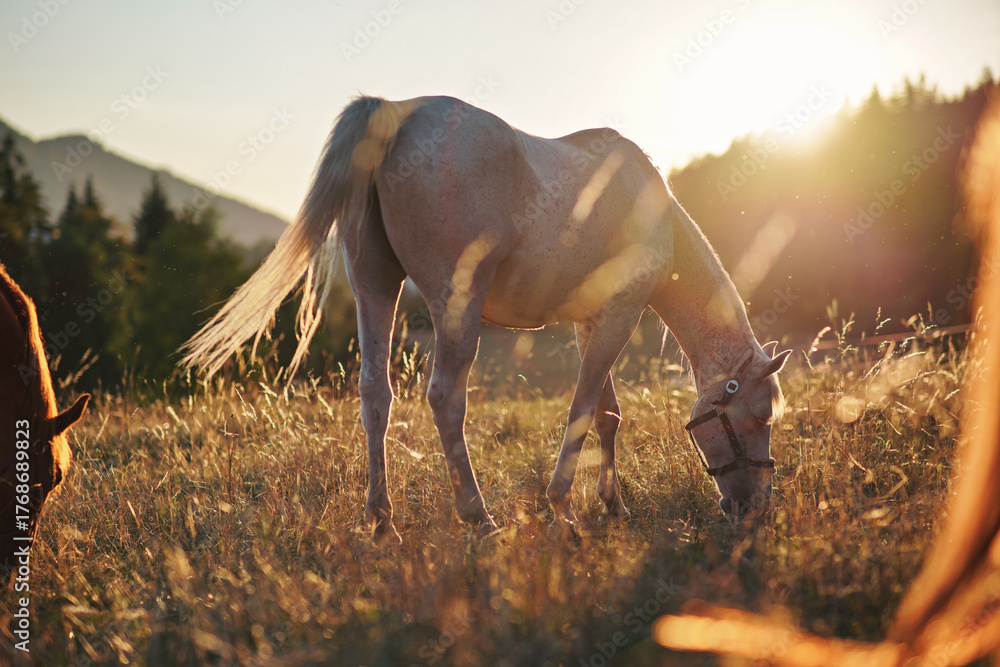 White Arabian horse grazing on green field, view from side, afternoon sun backlight