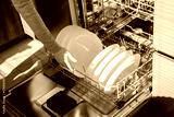 Loading plates into dishwasher rack - dishwasher, plates, loading, kitchen, clean.