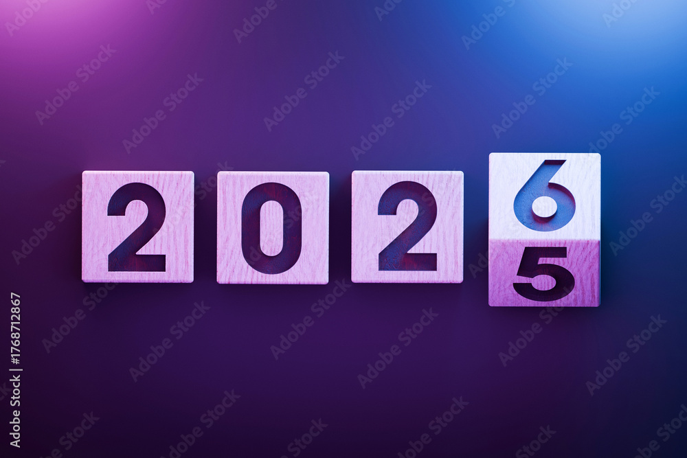 Wooden blocks showing the transition from 2025 to 2026 with pink and blue light background, New Year, change, and fresh beginnings. 2026 top view, creative idea. 2025 turns into 2026, concept
