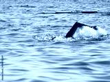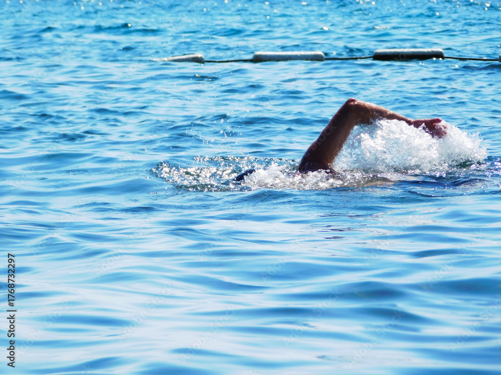 A man performs freestyle stroke in the open sea under bright sunlight, with water splashing around his arm mid-motion, captured from behind at water level.