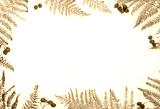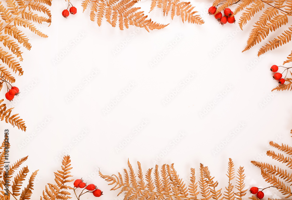 Autumn background with dry fern leaves and red hawthorn berries, flat lay frame on white surface, seasonal banner with copy space, natural composition for greeting card, holiday decoration, design
