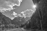Autumn landscape around Lago di Landro, Dürrensee in Tre Cime di Lavaredo park. Turquoise lake. A view on Cristallo Group and Ampezzo Dolomites. Rain and rays radiating from the sun. Cumulus clouds.