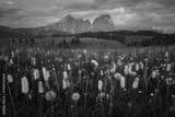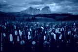 Colorful wildflowers and dandelions growing in alpine meadow in the Italian Dolomites at dusk, peaks in clouds at night. Summer in Alpe di Siusi, Italy. Colorful flowers, rocks, purple sky at dusk
