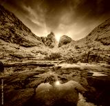 Vibrant orange and red sunrise illuminating snow-covered peaks, reflecting on the icy surface of frozen lake in a tranquil winter mountain landscape. Snowy mountains and frozen fjord. Lofoten, Norway