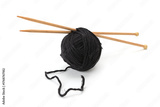 Ball of black yarn with wooden knitting needles inserted and loose strand resting on surface in minimal craft composition