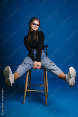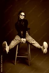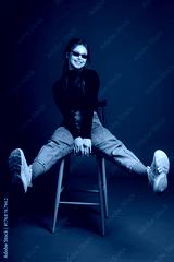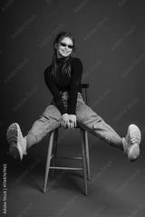 A Trendy and Colorful Portrait Showcasing a Young Woman Sitting Comfortably on a Stylish Stool