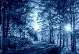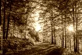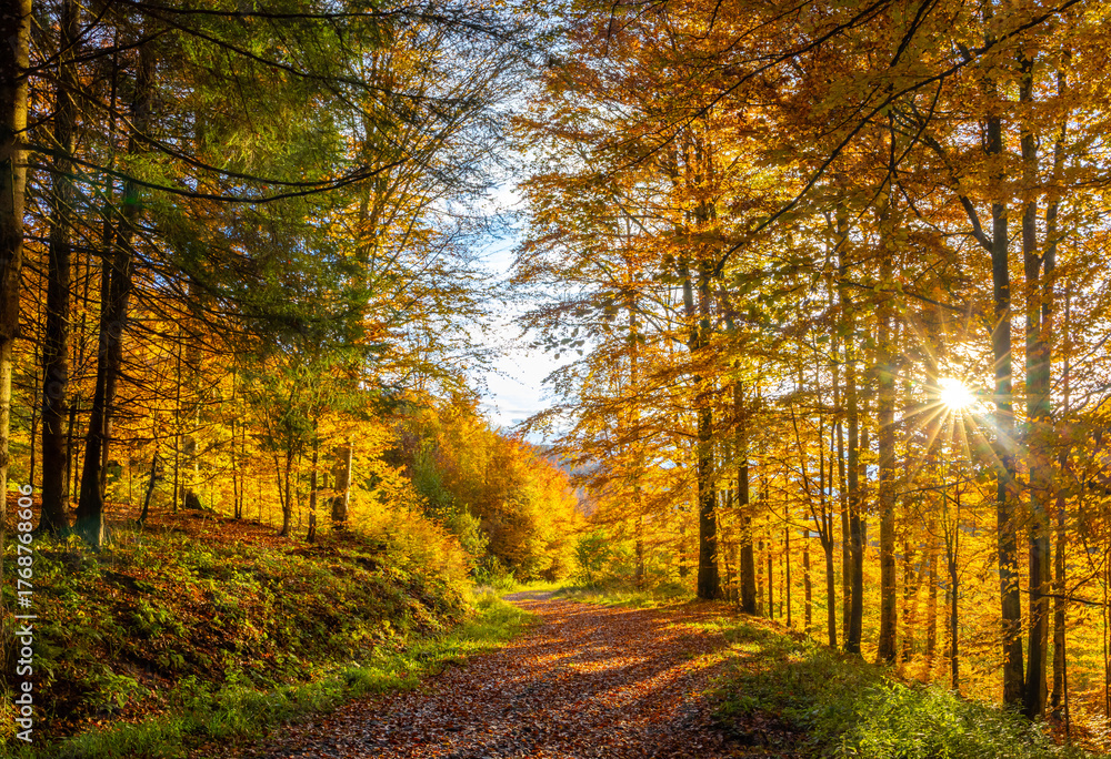 Path through the forest during autumn. The sun setting among the trees with golden leaves