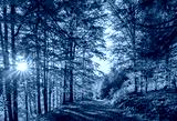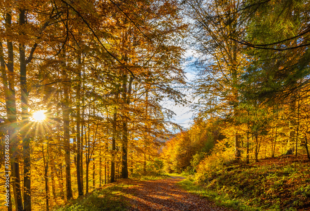 Morning landscape in a deciduous forest with vibrant autumn colors. A road covered in withered leaves through the autumn forest