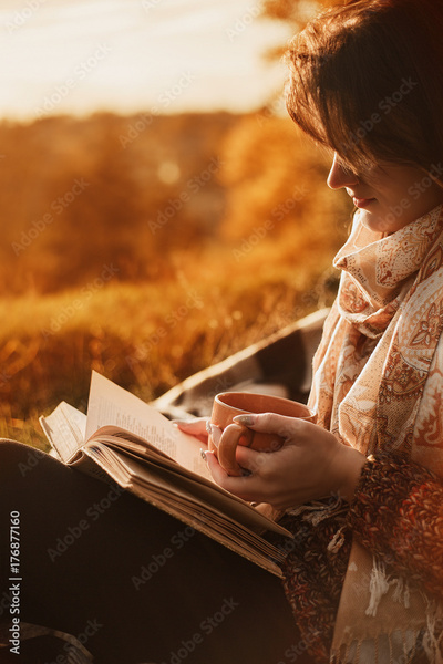 a woman sits near a tree in an autumn park and holds a book and a cup with a hot drink in her hands. Girl reading a book