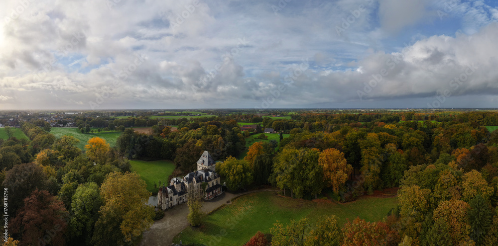 A breathtaking panoramic drone view of Kasteel van Westmalle, Belgium, captured in October 2025 just after a gentle autumn rain