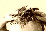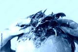Male hands wash their hair with shampoo and foam on blue background close-up.