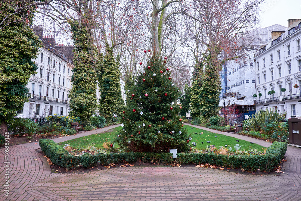 A Christmas tree decorated with red and silver balls in a little garden between houses