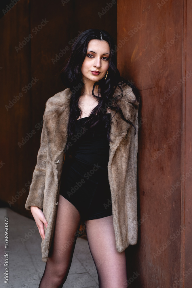 Stylish brunette model in black bodysuit, stocking, eco fur coat and heels posing by copper and stone walls