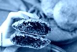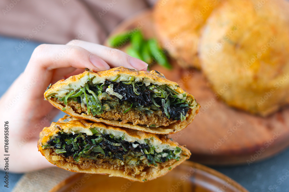 Hand holding an Ote-Ote Porong or oyster cake that is cut in half, revealing a savory filling of oysters, meat and green onions. In the background are green chilies (cabe rawit).