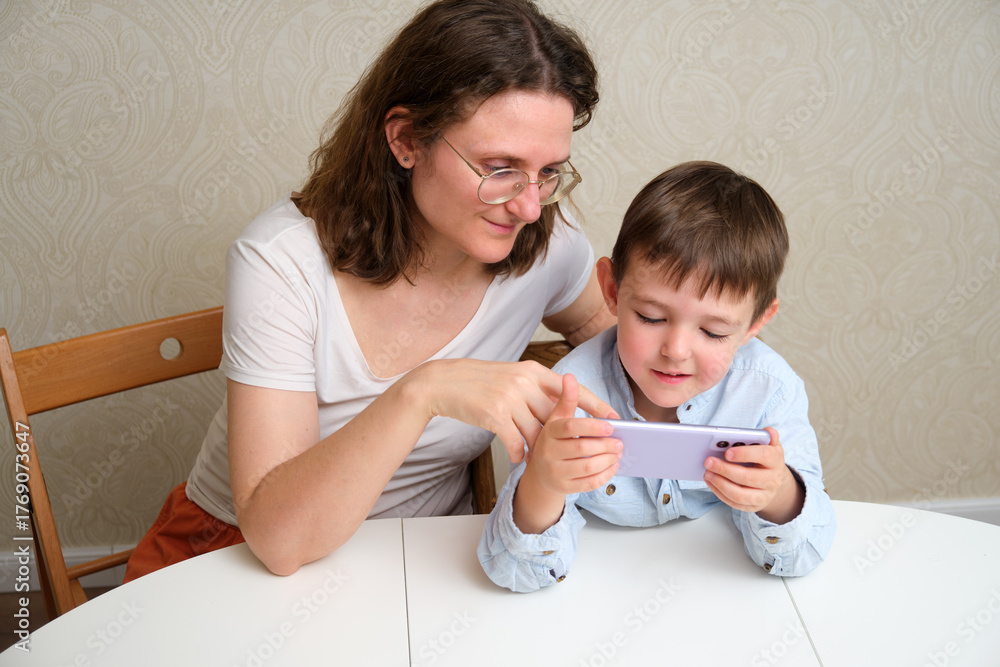 Woman and child watching video on phone. Mom helping son playing game on smartphone for digital communication and parenting. A child aged 4 years (four years old)