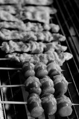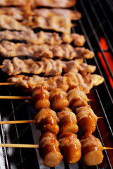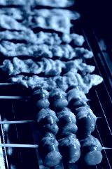 Thai-Asian style barbecue meatballs called 'Mala' served with a rich chili sauce sold as street food.