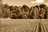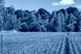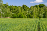A Lush Green Field Surrounded by Dense Trees Beneath a Beautiful Blue Sky with Fluffy Clouds