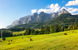 Captivating view of Alpine green fields and traditional wooden houses near Werfen am Tennengebirge with cow