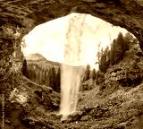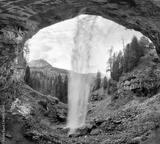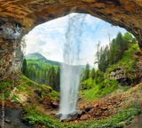 View through a waterfall into a valley with forests and mountains - johannes waterfall, Austria Alps mountain
