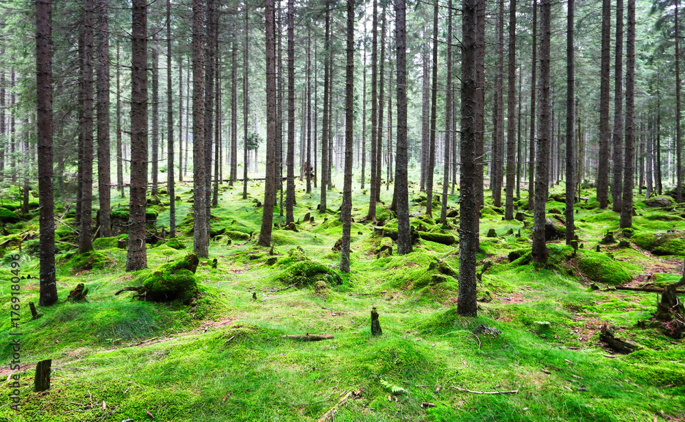 Panorama of an amazing scenic forest with fresh green trees and the foliage